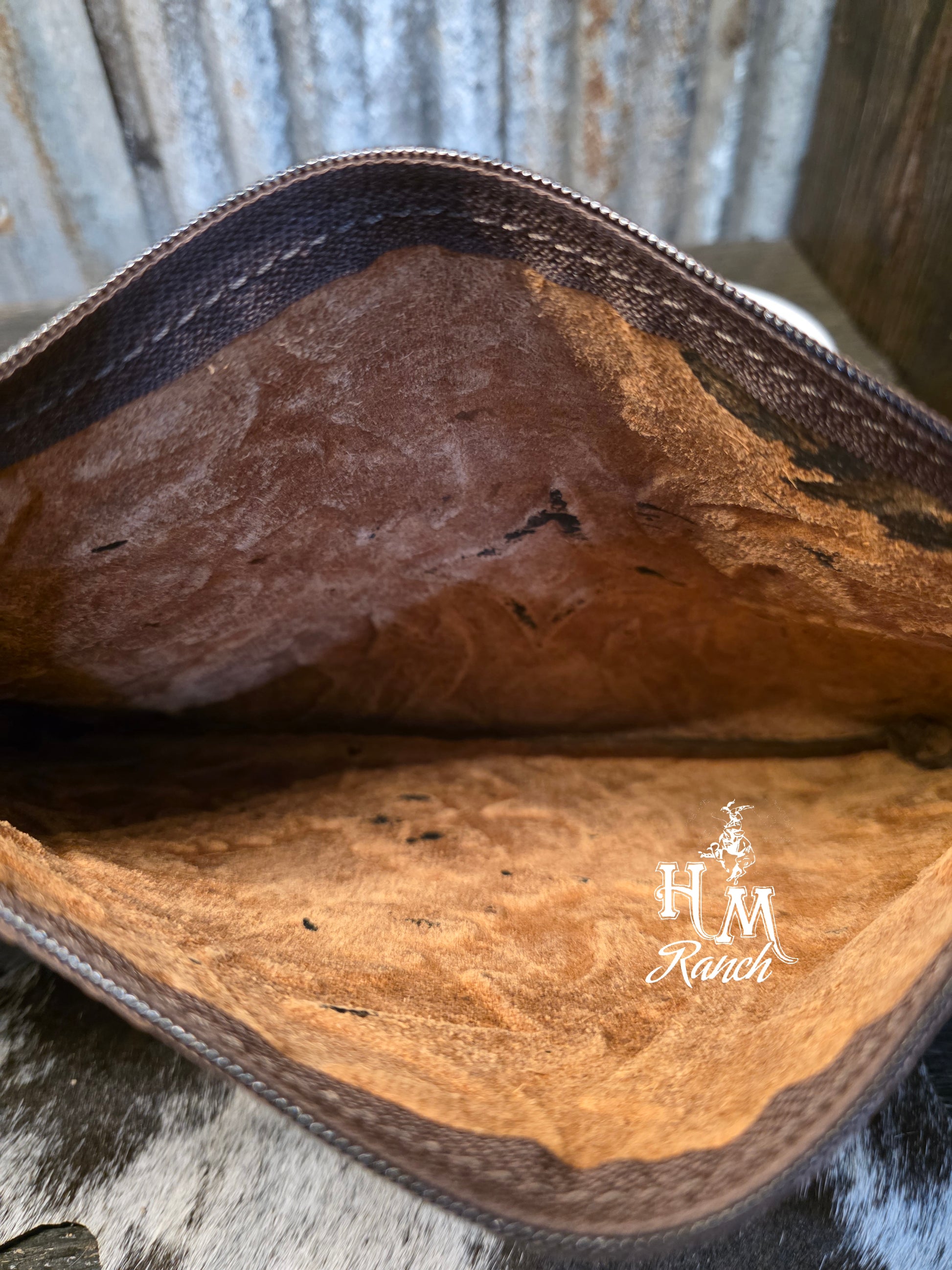 This elegant bank or makeup bag features heavy embossed brown Boot Top Laredo leather with a clean, understated design that draws admiration wherever you take it. Measuring about 12" wide by 7" tall, it includes a zipper closure with leather stops and a leather pull tab. Both front and back display the same detailed pattern. Please note, the bag is unlined, emphasizing its natural leather craftsmanship.