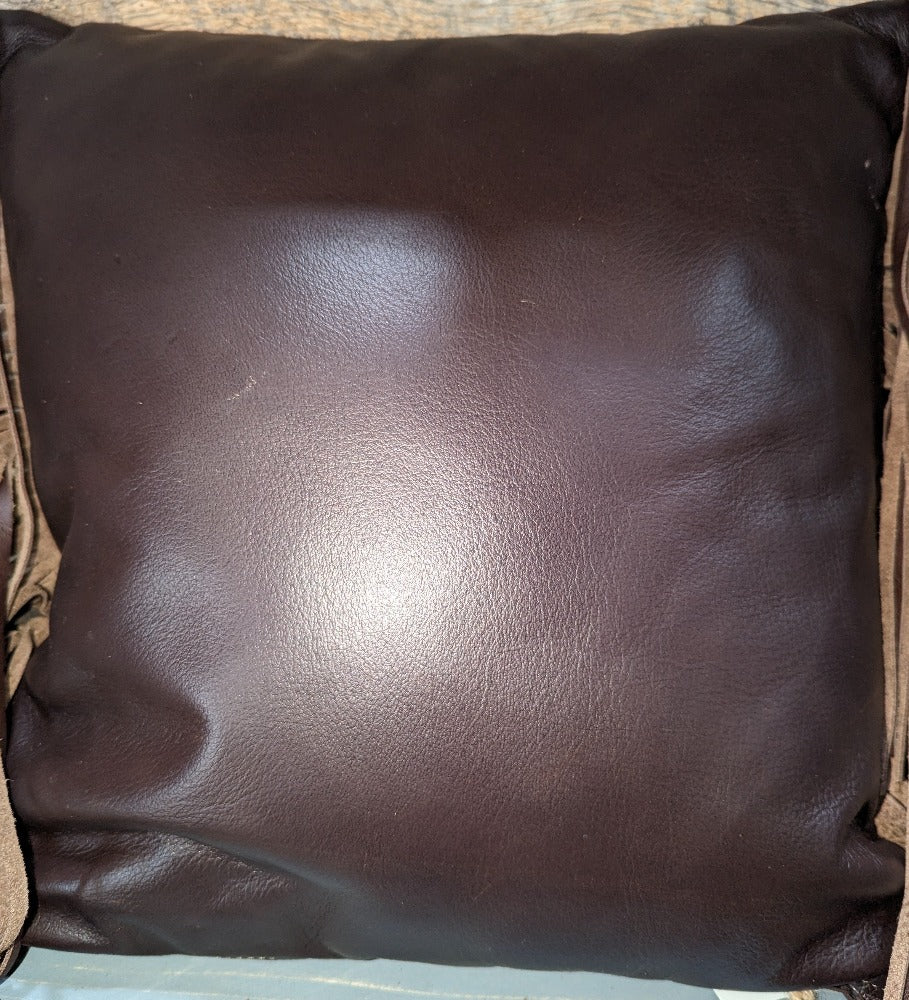 Hair on hide with a Longhorn, made with Pendleton™ Wool inlay, distressed chocolate leather back with zipper closure, chocolate Fringe, pillow insert included. The leather back will have individual markings and coloring- will only become more rustic with age.