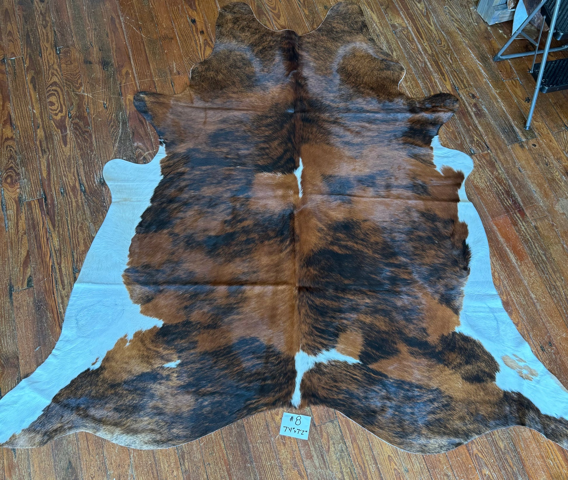 Beautiful Brazilian cowhide rug, Tri Color Brindle hide with white belly . Stunning hide with black, brown and red tones throughout. This hide will weigh approx. 10/12 pounds. Statement piece cowhide rug, this is a premium Brazilian cowhide rug.