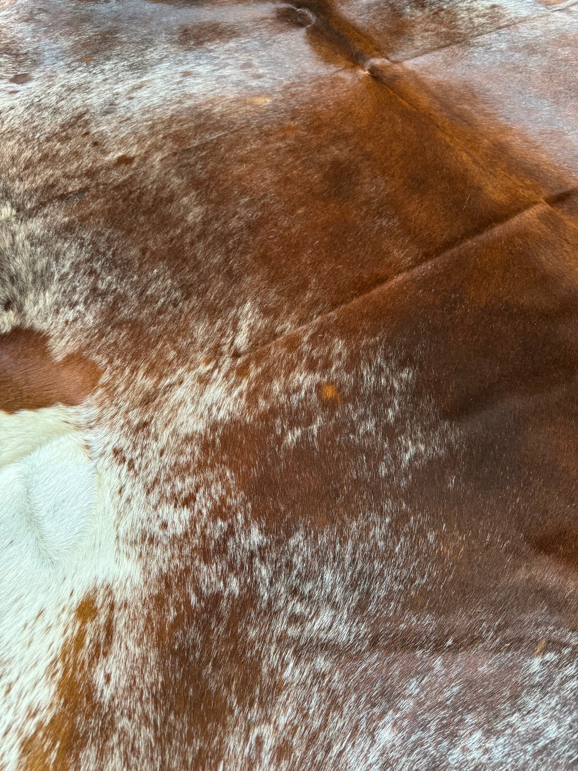 Beautiful Brazilian cowhide rug, Strawberry Roan Hide with white belly . Stunning hide with Red roan colors and spotting throughout. This hide will weigh approx. 10/12 pounds. Statement piece cowhide rug, this is a premium Brazilian cowhide rug.