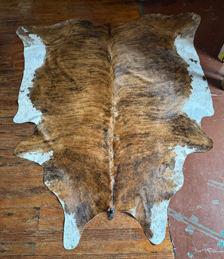 Beautiful Brazilian cowhide rug, Red brindle with white underbelly. This hide will weigh approx. 10/12 pounds. Statement piece cowhide rug, this is a premium Brazilian cowhide rug.
