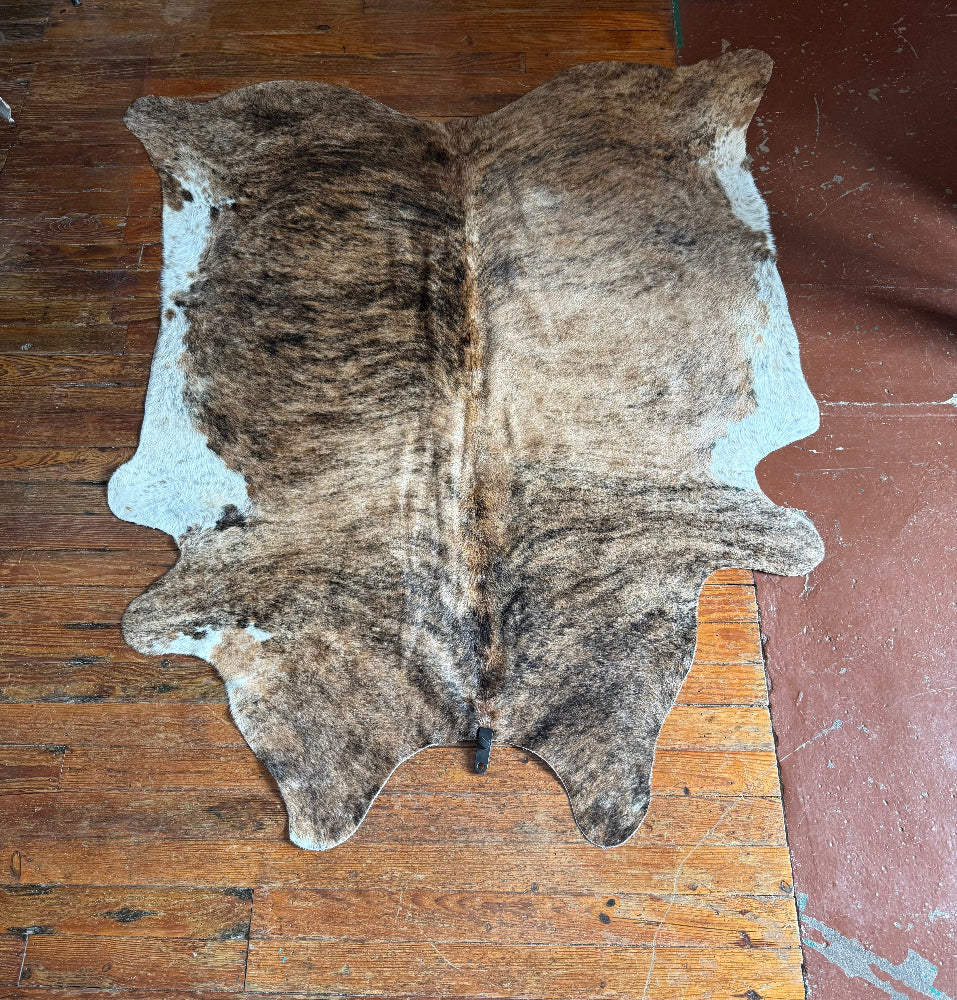 Beautiful Brazilian cowhide rug, brindle with white underbelly. This hide will weigh approx. 10/12 pounds. Statement piece cowhide rug, this is a premium Brazilian cowhide rug.