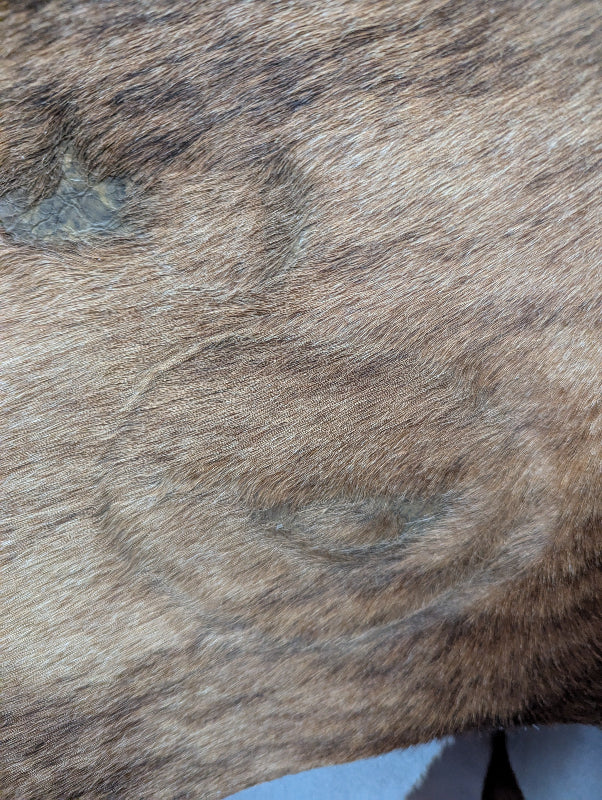 Beautiful Brazilian cowhide rug, light tan brindle with speckled white under belly. There are brands on this hide as pictured. This hide will weigh approx. 10/12 pounds. Statement piece cowhide rug, this is a premium Brazilian cowhide rug.