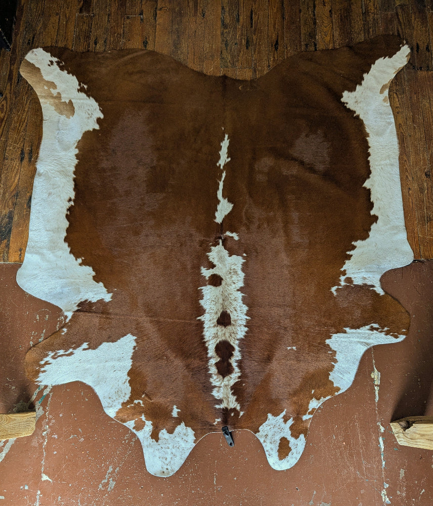 Beautiful Brazilian cowhide rug, hereford with white underbelly and down back. This hide will weigh approx. 10/12 pounds. Statement piece cowhide rug, this is a premium Brazilian cowhide rug.