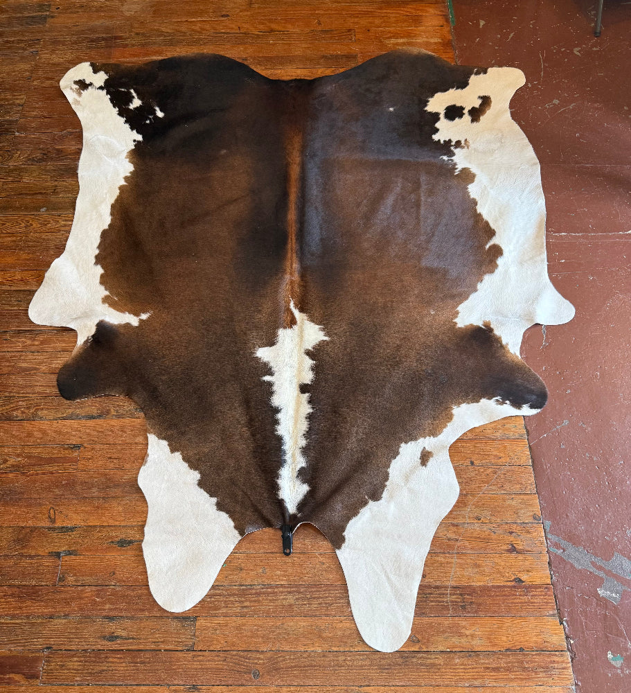 Beautiful Brazilian cowhide rug, brown with white under belly and partial white line on back. This hide will weigh approx. 10/12 pounds. Statement piece cowhide rug, this is a premium Brazilian cowhide rug.