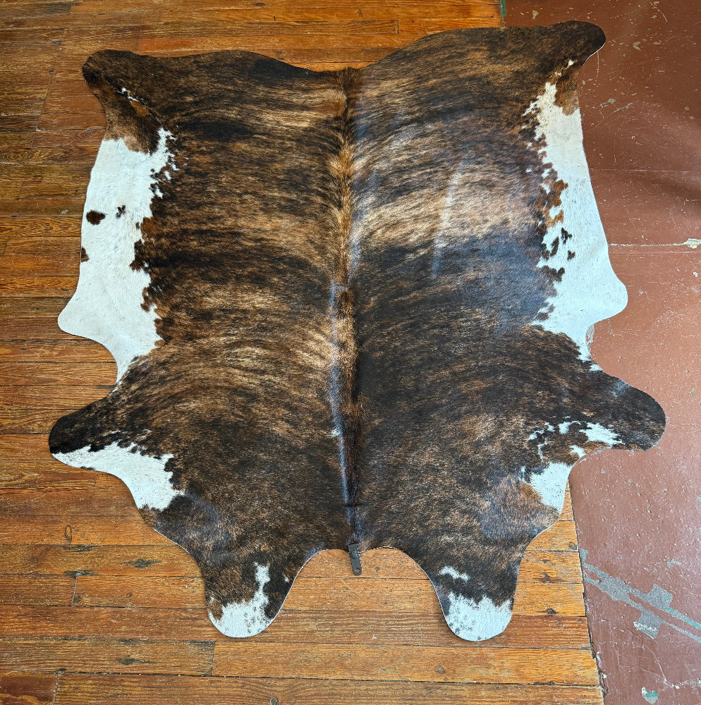Beautiful Brazilian cowhide rug dark brindle with white under belly. This hide will weigh approx. 10/12 pounds. Statement piece cowhide rug, this is a premium Brazilian cowhide rug.