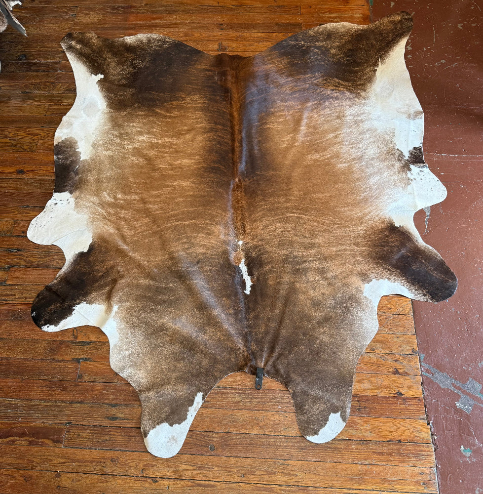Beautiful Brazilian cowhide rug, brown with white under belly and partial line back. This hide will weigh approx. 10/12 pounds. Statement piece cowhide rug, this is a premium Brazilian cowhide rug.
