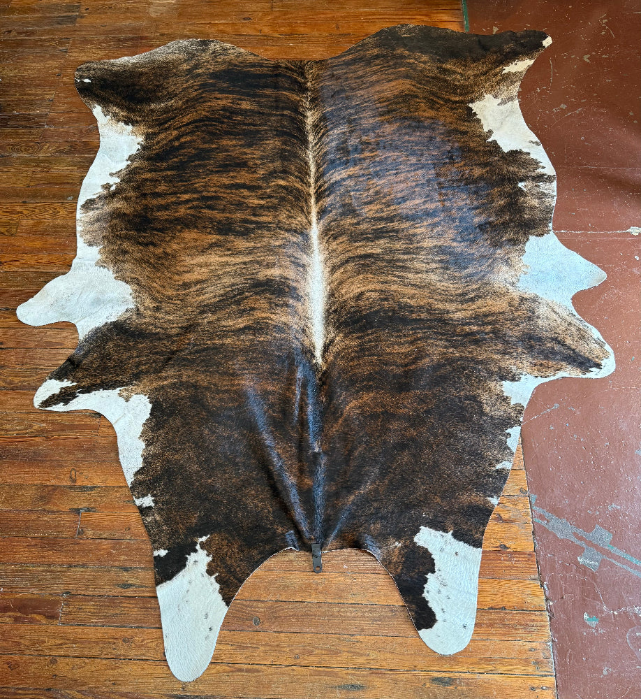 Beautiful Brazilian cowhide rug, brown brindle with some white under belly and line back. This hide is extra long and narrow for it's length. Weight is approx. 10/12 pounds. Statement piece cowhide rug, this is a premium Brazilian cowhide rug.