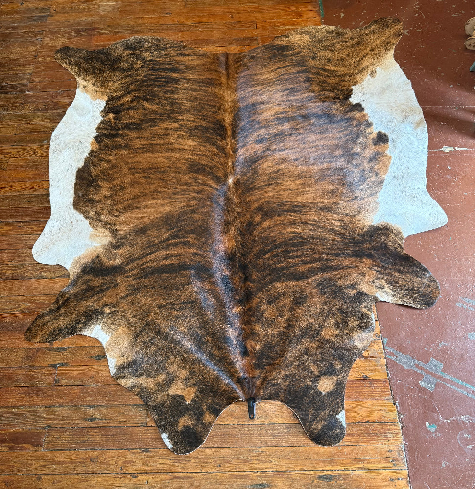 Beautiful Brazilian cowhide rug, brown brindle with white under belly. Weight is approx. 10/12 pounds. Statement piece cowhide rug, this is a premium Brazilian cowhide rug.