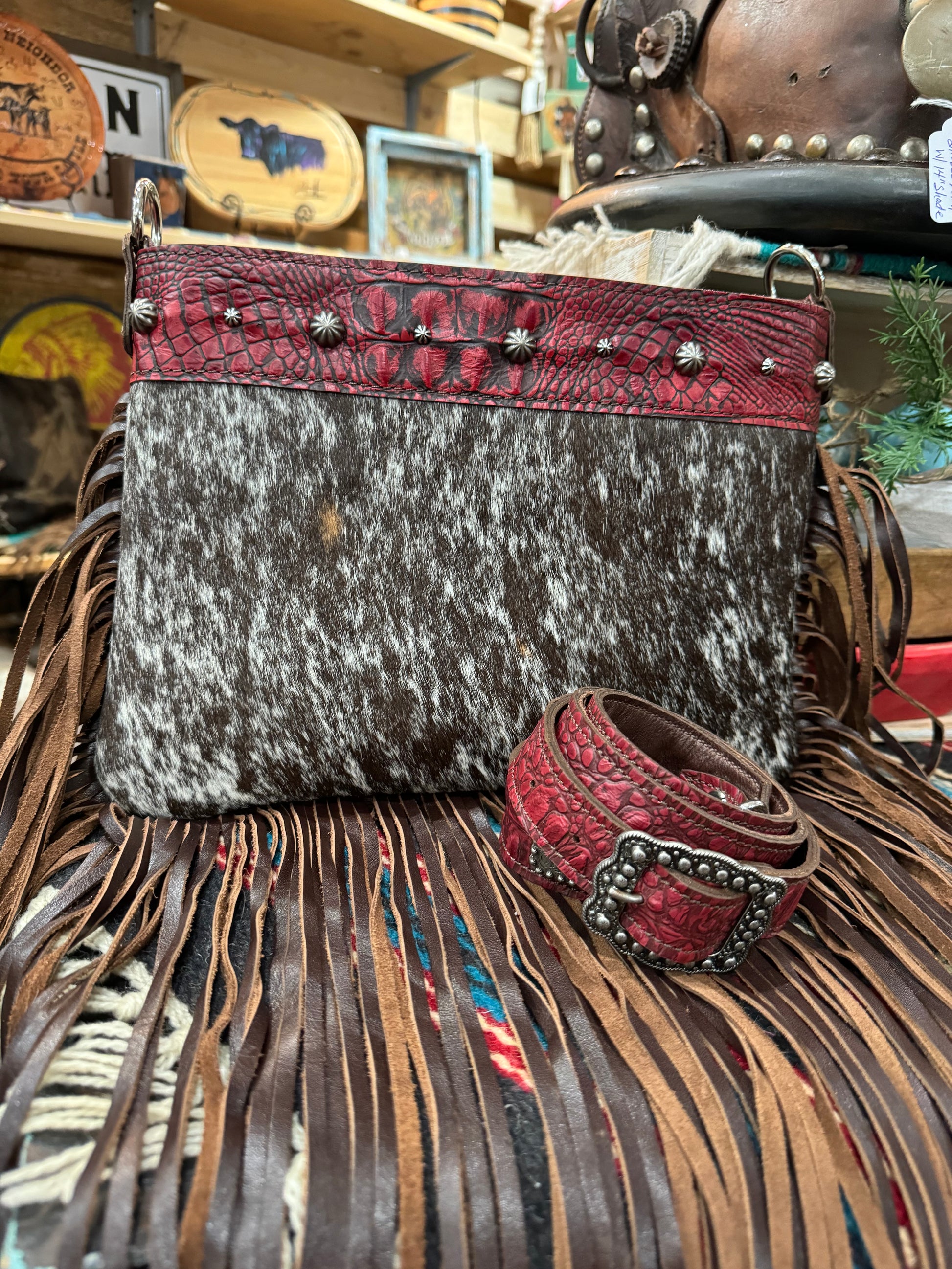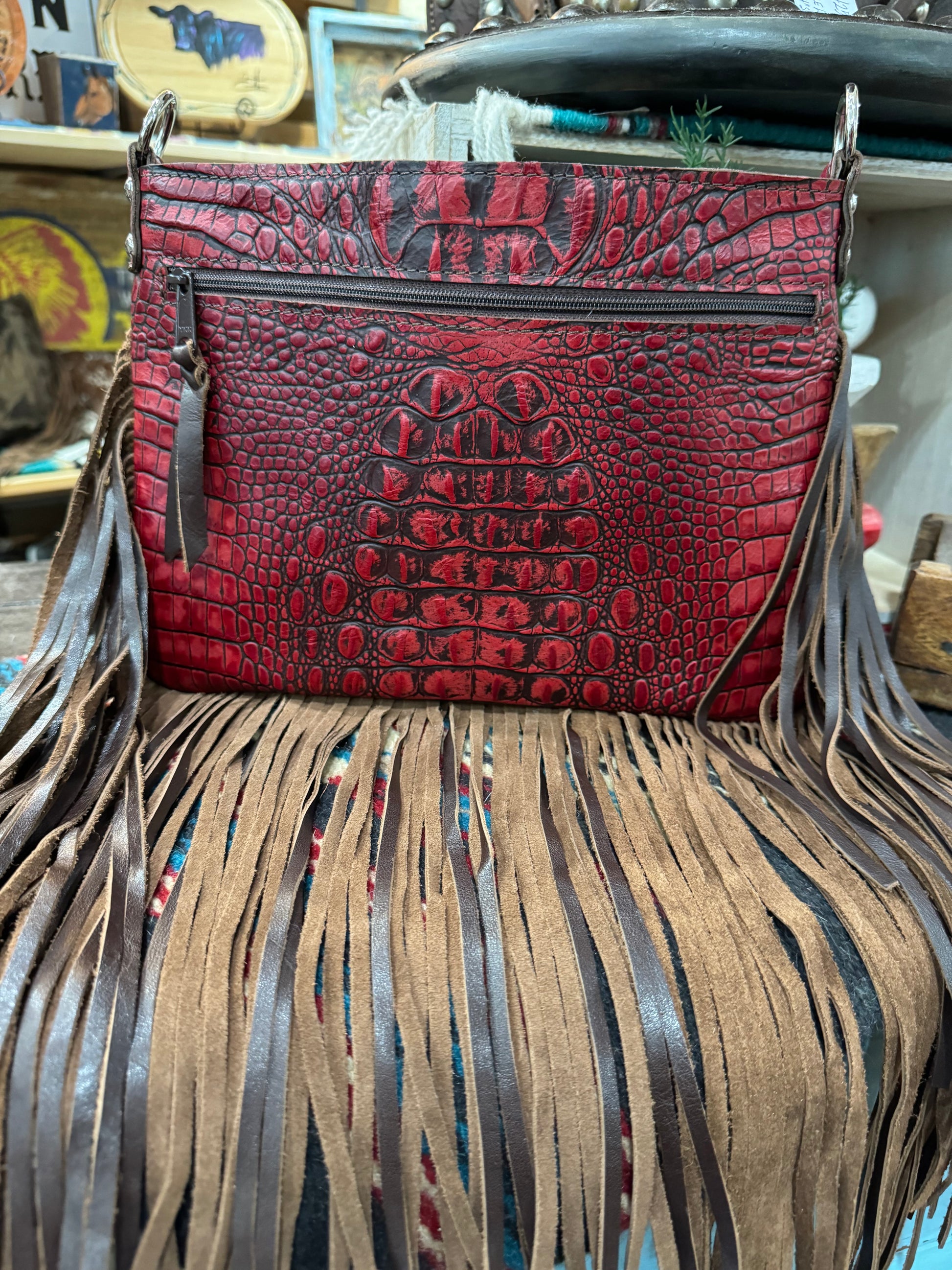 Beautiful Brown and tan speckled front, heavy embossed Red croc with a hint of black tones leather. Our half pint is just that, half the size of our XLG Crossbody Sling. This little pint, is packed with the same features as her larger version! Measures approximately 8.5" x 12", 12" leather lined interior with two coordinating embossed leather pockets, Zipper back pocket, chocolate fringe on all 3 sides, crossbody strap, detachable snaps, mini berry buckle, and buffalo conchos.