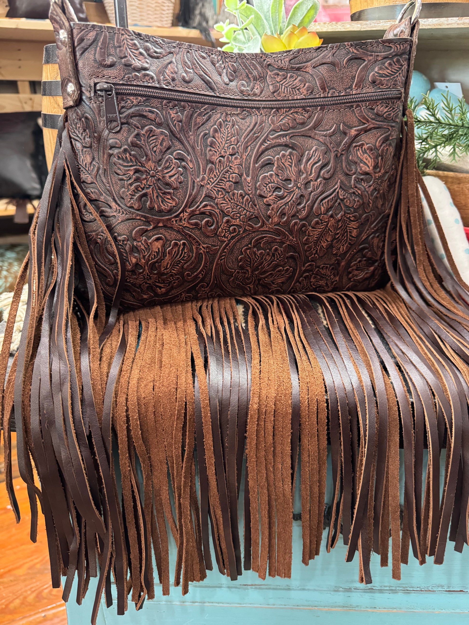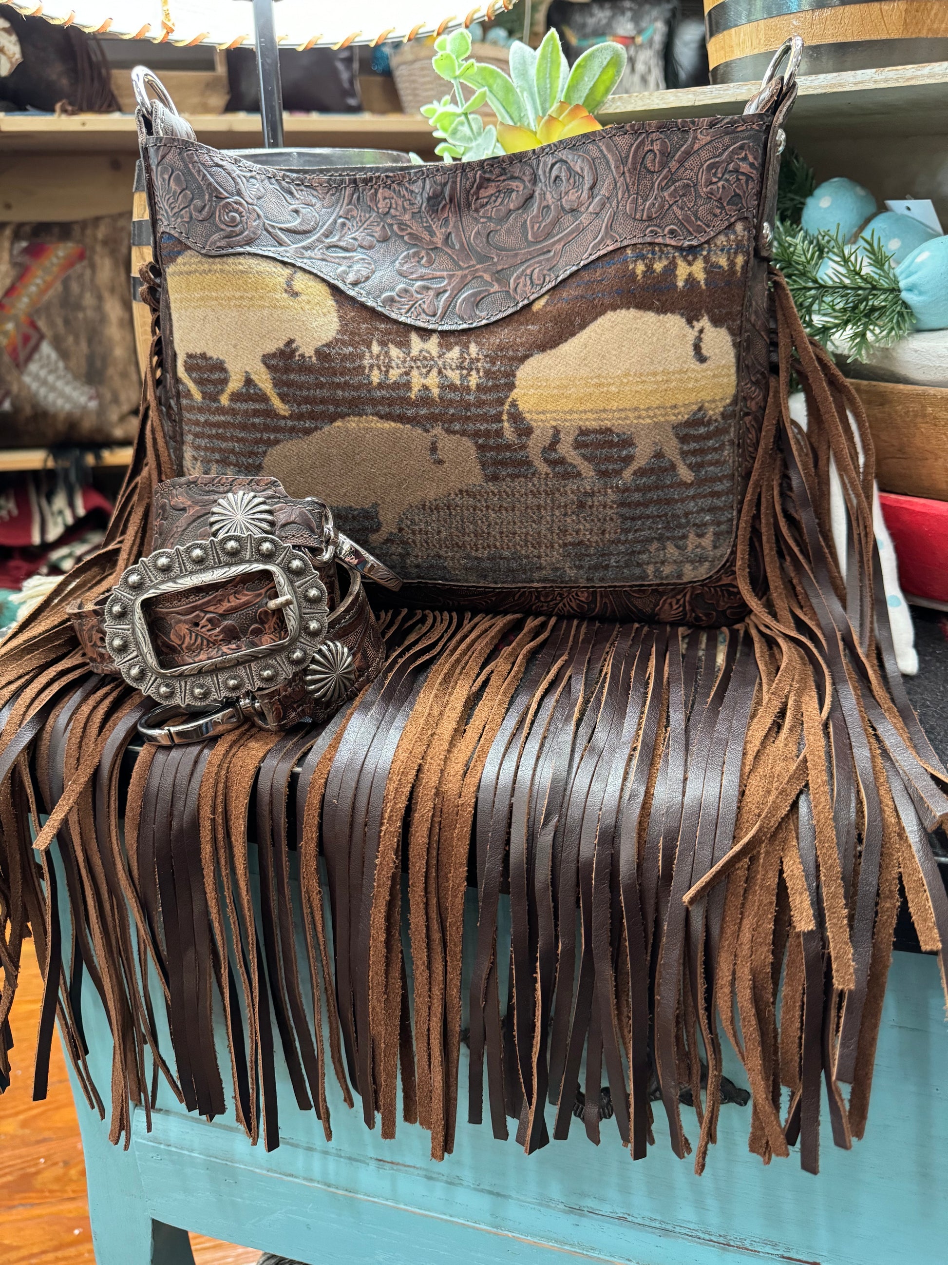 Classic Boot Cowboy Tool Leather, This bag has the perfect western flair for the rodeo or date night. Our little Half Pint, is packed with the same features as her larger version! Heavy embossed Cowboy Tool leather with scalloped Pendleton® Wool inlay - Perrie Rush Hour. The large zipper back pocket will hold your essentials, while the main interior will secure your wallet. Measures approximately 8.5" x 12", 18" , fringe on all three side, and detachable snaps, two interior pockets, zipper back pocket, and full leather lining.
