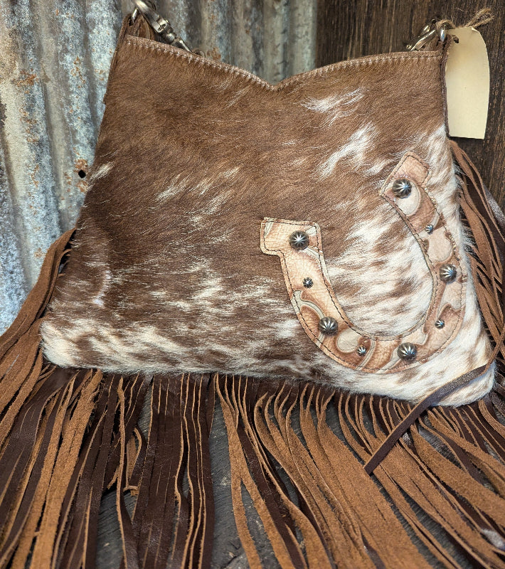 Yes, another bag that makes the "Wow," statement when you walk into the room. This small hobo features heavy embossed Tan and Ivory leather with Brown and white speckled hide front, a studded horseshoe applique, two interior matching leather pockets, magnetic snap closure, zipper back pocket, coordinating crossbody strap that measures 45" down to 38" from clip to clip, strap is detachable that allows for interchangeable straps, and 12" brown fringe.