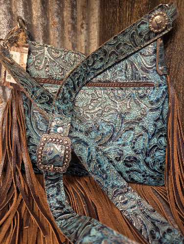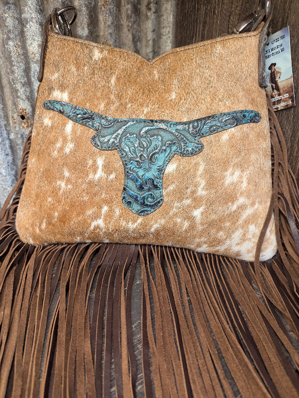Yes, another bag that makes the "Wow," statement when you walk into the room. This small hobo features heavy embossed turquoise leather longhorn applique on tan and white speckled hide front. It has two interior matching leather pockets, magnetic snap closure, zipper back pocket, coordinating crossbody strap that measures 45" down to 38" from clip to clip, strap is detachable that allows for interchangeable straps, and 12" brown fringe.