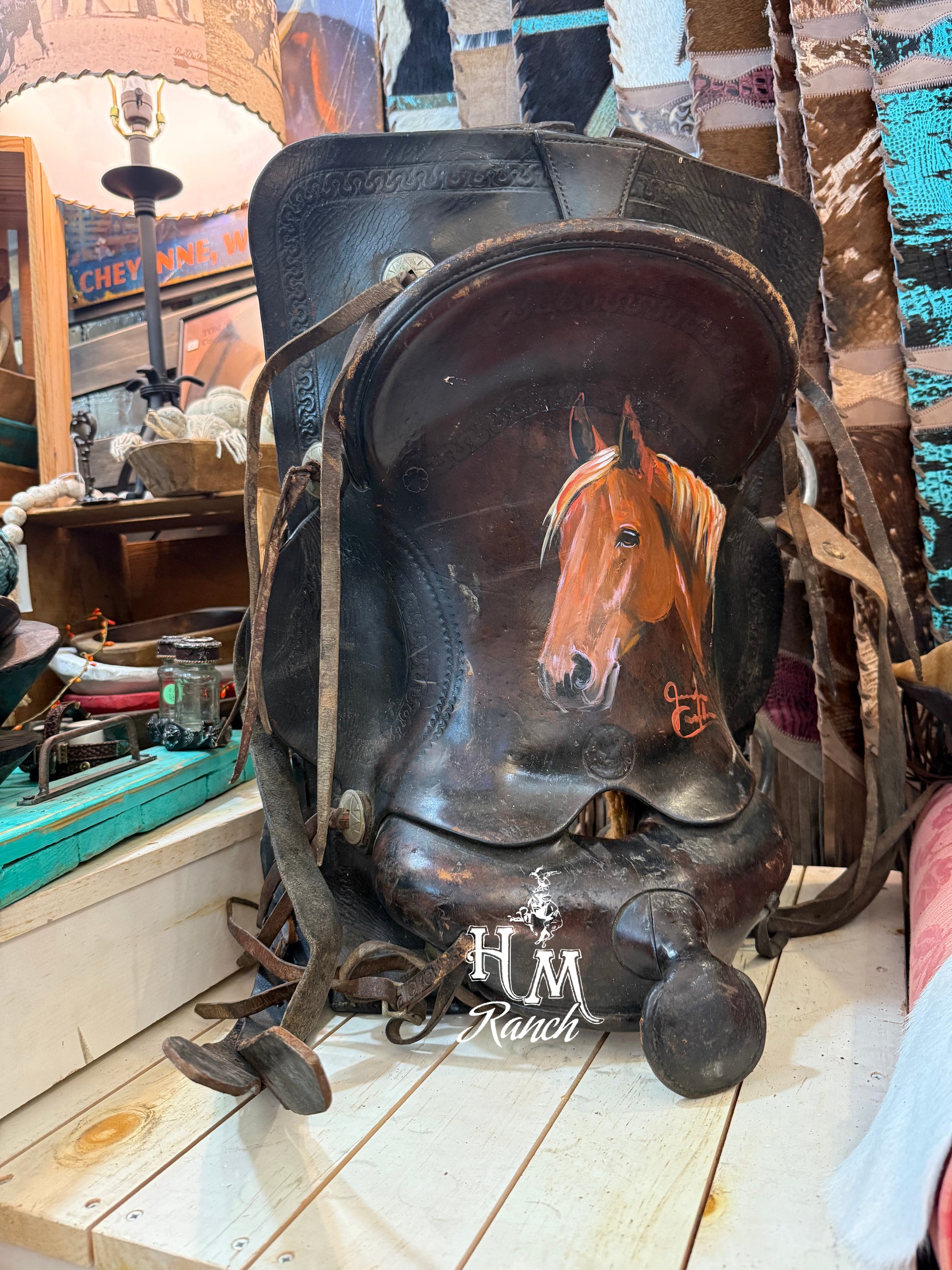 Sorrel horse painted by western artist Jennifer Casebeer. She captures the majesty beauty of this beautiful breed. Somehow, you can stare deep into their eyes and they seem so real. Pink nose with pink highlights throughout Profile view of head as the neck fades into the saddle. blaze face, and hints of blue and pink in the white mane. Leather saddle is stamped, but too worn to read, does have edge tooling on the skirt. Saddle is very old and worn with history.