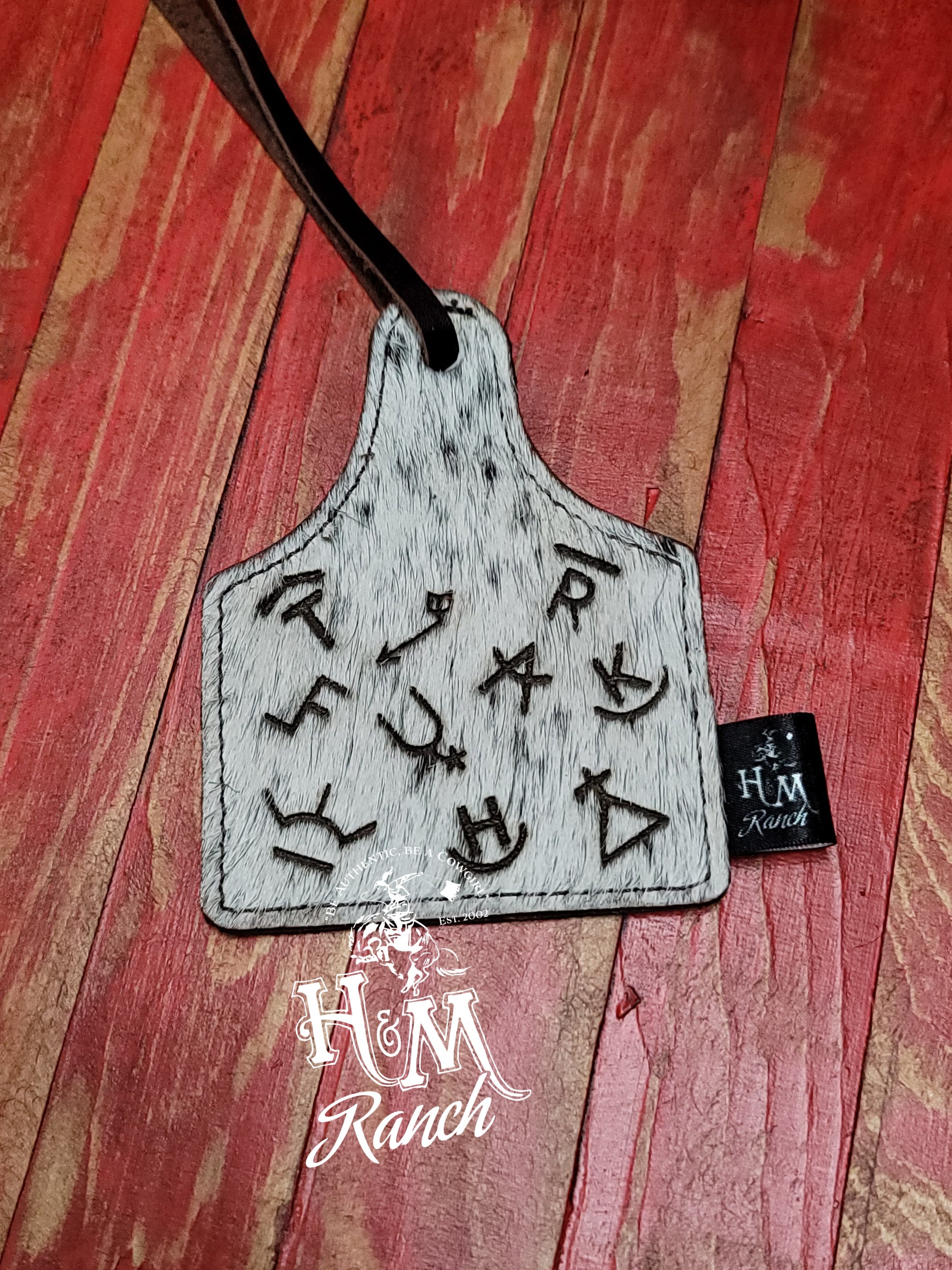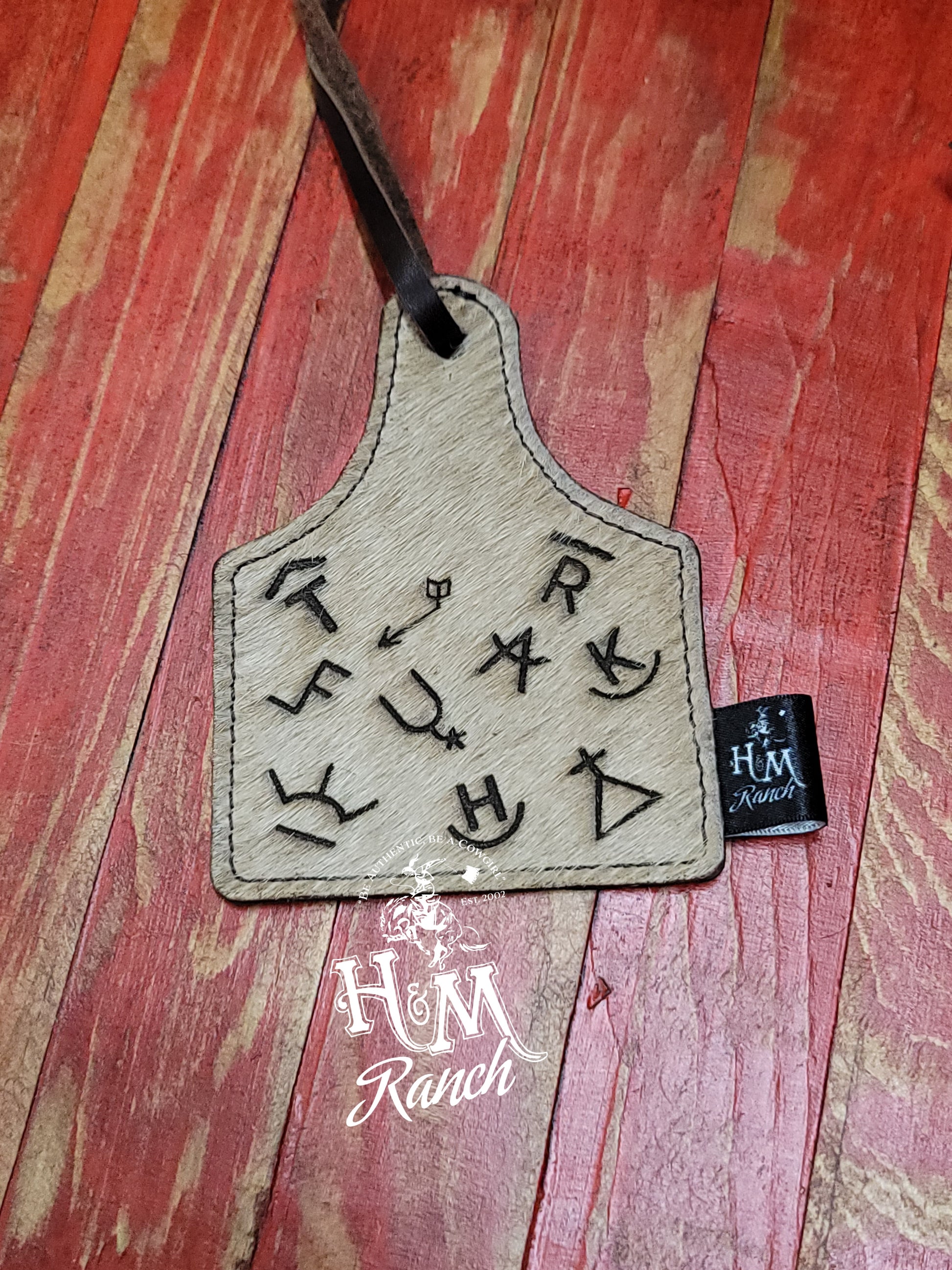 Leather ear tag car freshie made in house at H&M Ranch Store. Hair on hide front with brands on front and leather backing.