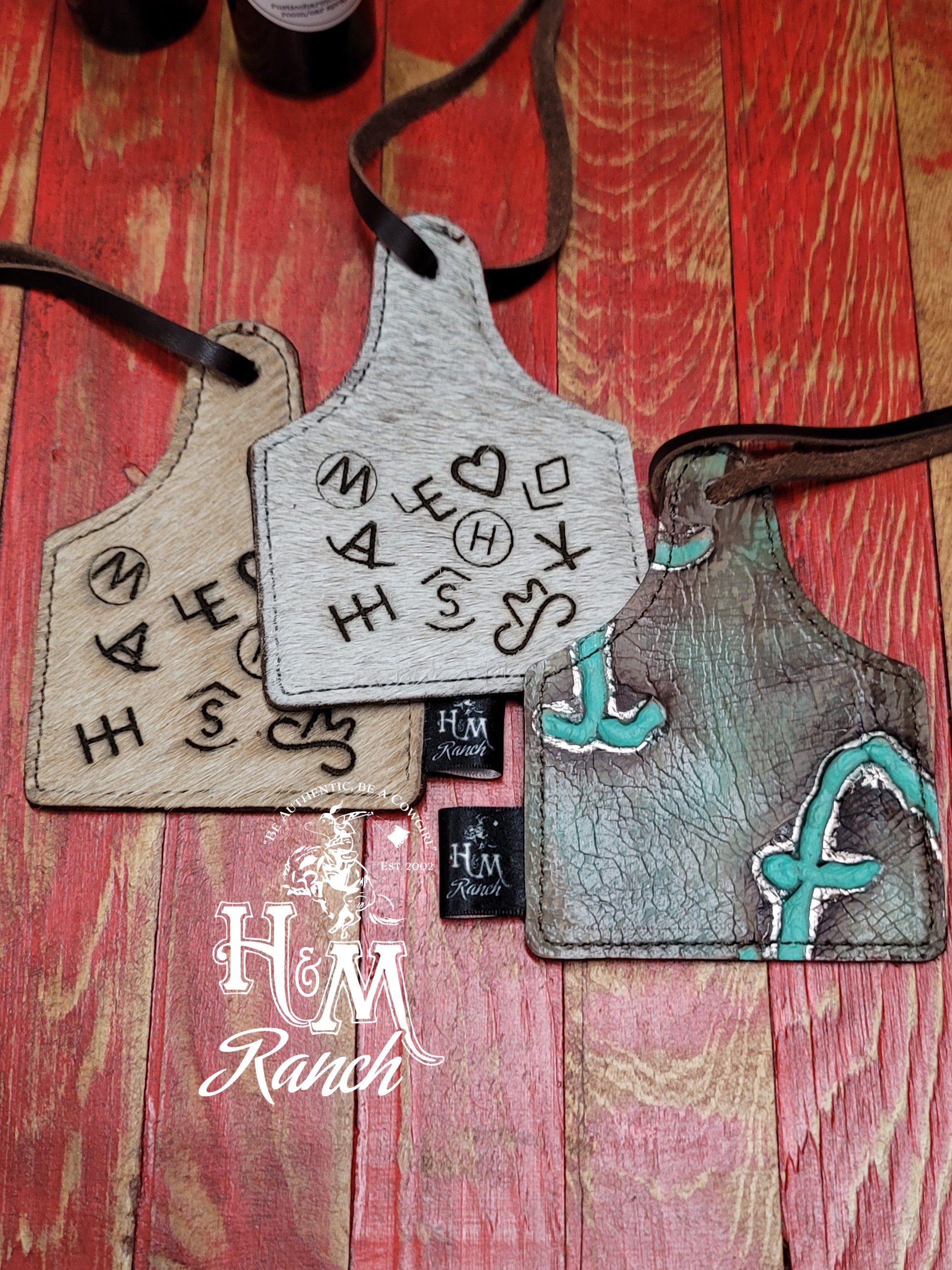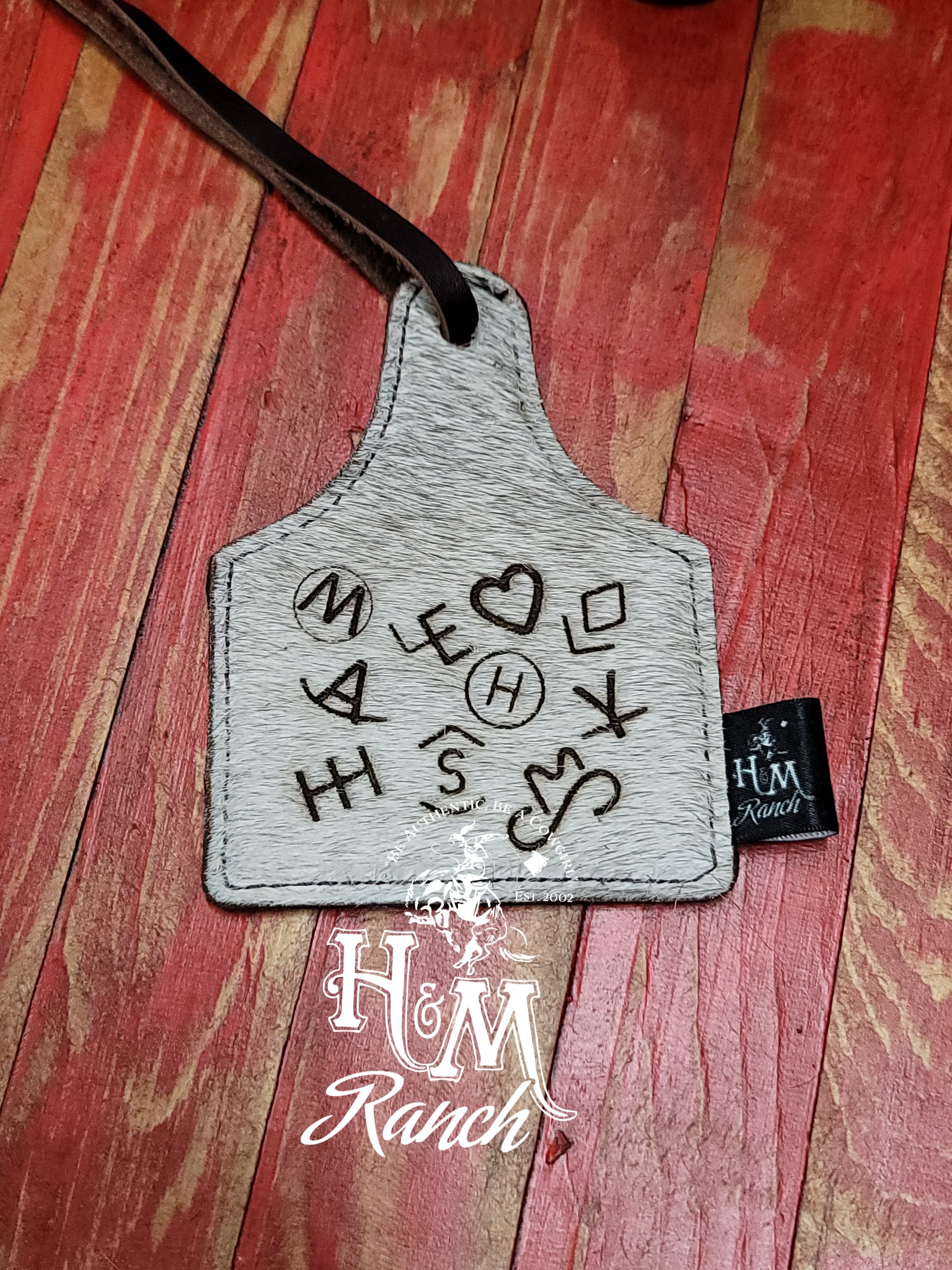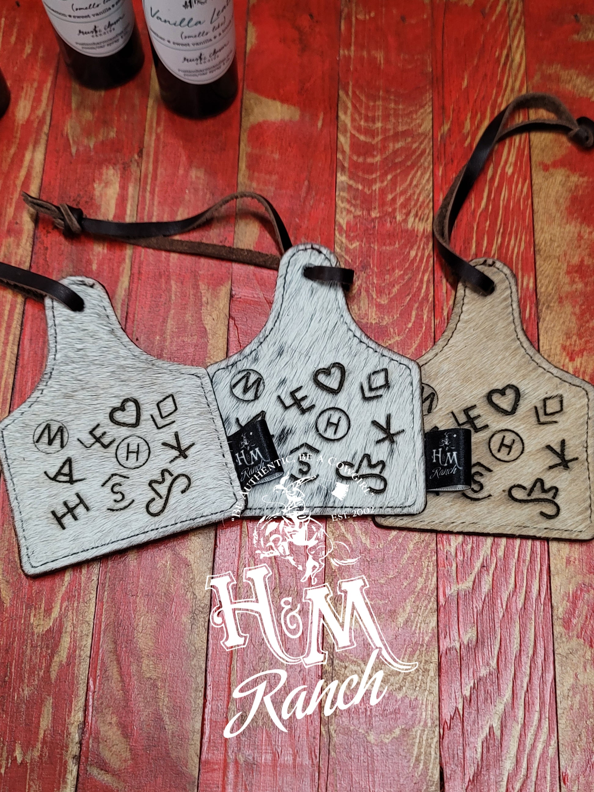 Leather ear tag car freshie made in house at H&M Ranch Store. Hair on hide front with brands on front and leather backing.