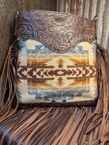 This bag has the perfect western flair for the rodeo or date night. Our little Mid Rise, is packed with the same features as her larger version! Heavy embossed Cowboy Tool leather with scalloped Pendleton® Wool inlay - Wheatland. You are going to "Wow" the crowds with bold 12" fringe. It doesn't stop there! The large zipper back pocket will hold your essentials, while the main interior will secure your wallet with a zipper closure as well. Measures approximately 9" x 7.75" with 12" Side fringe, fringe on either side, and detachable snaps, two interior pockets, zipper back pocket, and full leather lining.