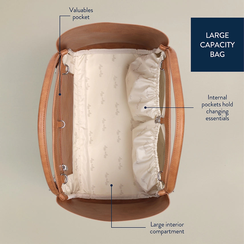 - - 1 external slip pocket, 2 elastic internal storage pockets, and 1 zipper parent essentials pocket