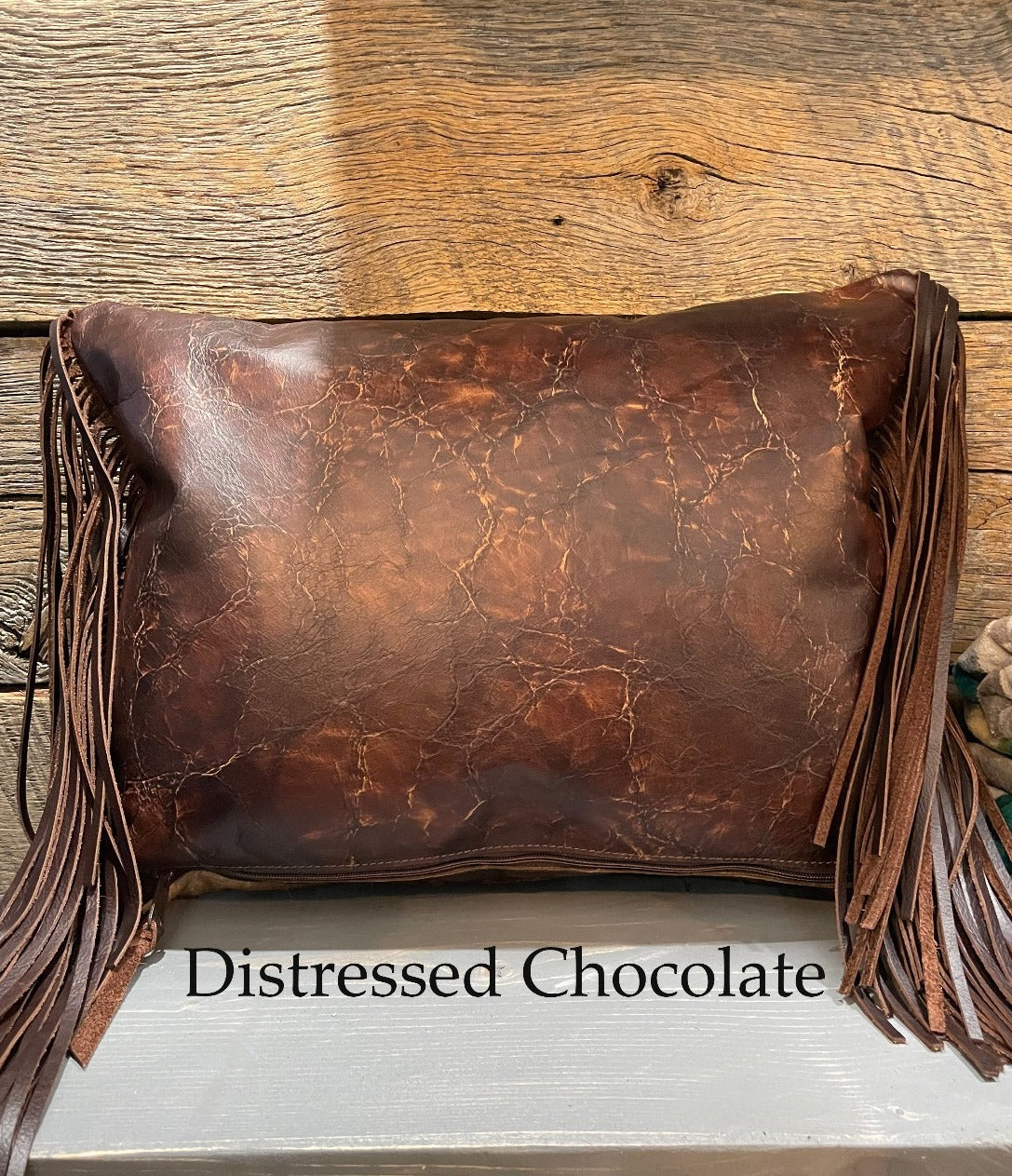 Custom Pendleton™ inlay, accent pillow with your brand or initial - classic statement piece for years to come. Pillow is made with rich hair on hide brindle tones, made with Pendleton™ Wheatland wool inlay, smooth distressed dark leather back, zipper bottom closure, and finished off with 12" fringe on either side. Seriously, this pillow will make you smile each and every time you walk by.