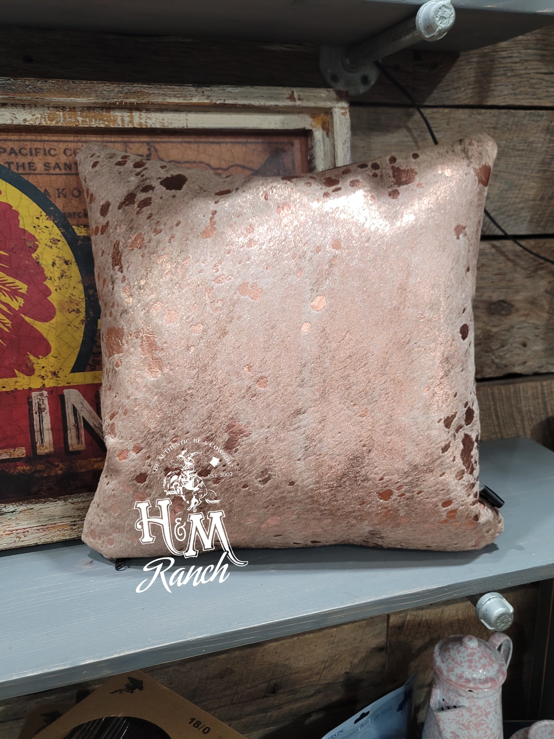 Here is a bold Rose Gold Acid Wash hair on hide front, with faint streaks of brindle is beautiful as a single pillow or will stand out with several additions. Back of pillow is a distressed chocolate leather back with zipper closure, feather down pillow insert included.
