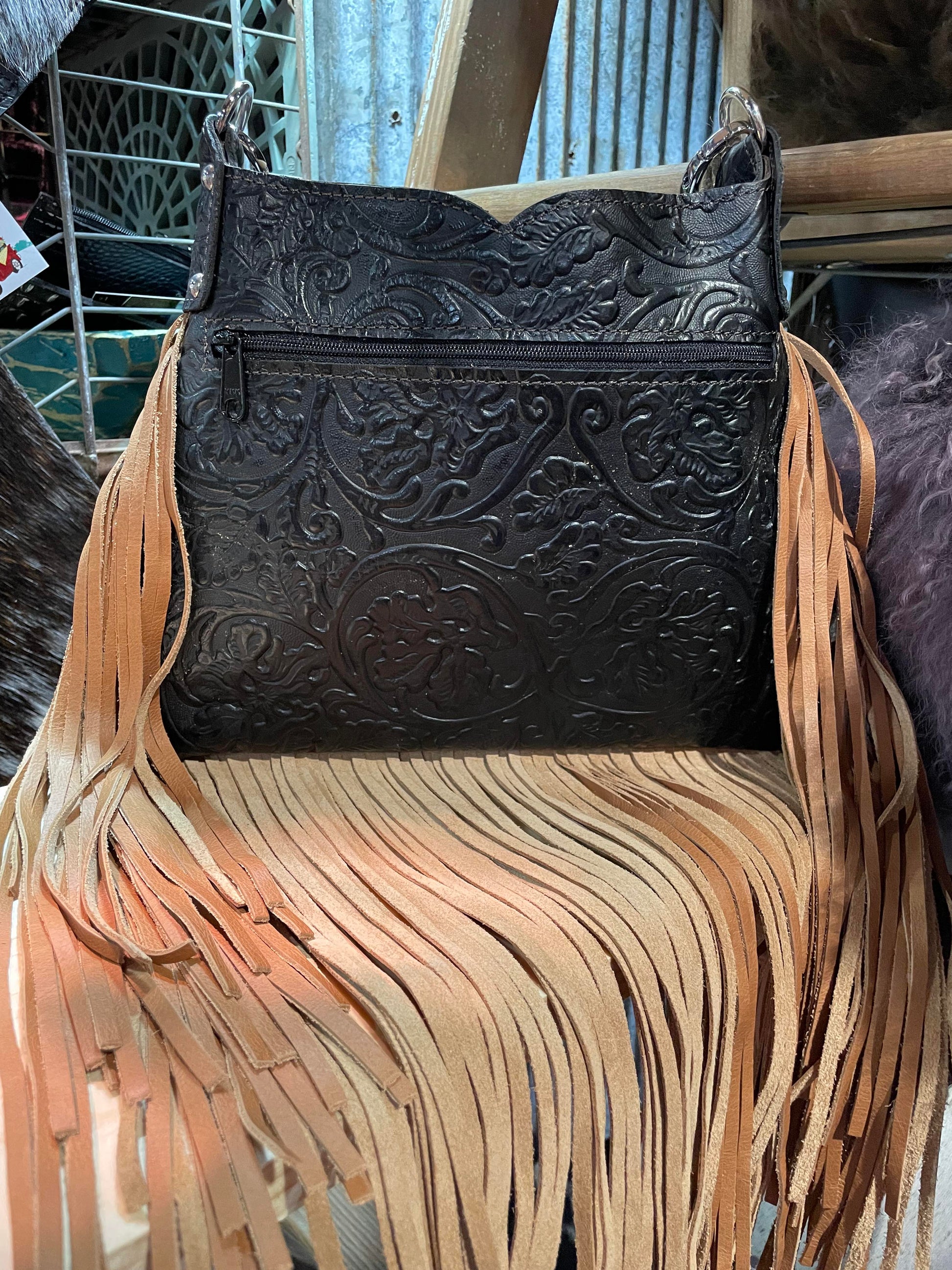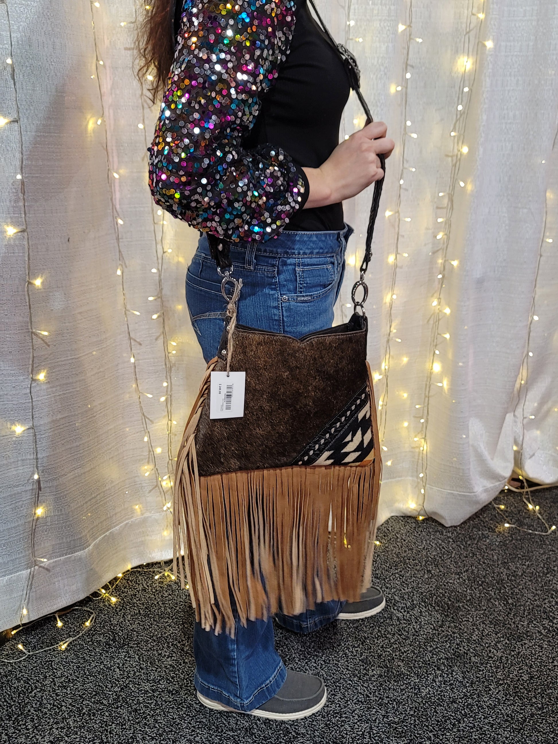Genuine leather handbag in the H&M Ranch Store small hobo style. Handbag features hair on hide dark front completed with Pendleton wool corner and buck stitching. heavy embossed black cowboy leather back, and large zipper back pocket. Interior has two coordinating leather pockets, magnetic snap closure, matching crossbody strap that measures 45" down to 38" from clip to clip, strap is detachable that allows for interchangeable straps, mini berry buckle, two conchos, and long 12" tan fringe.