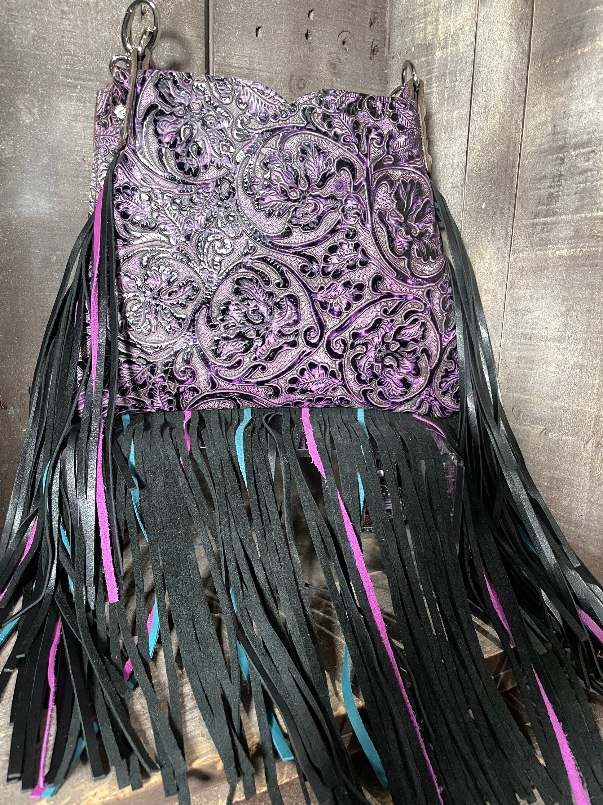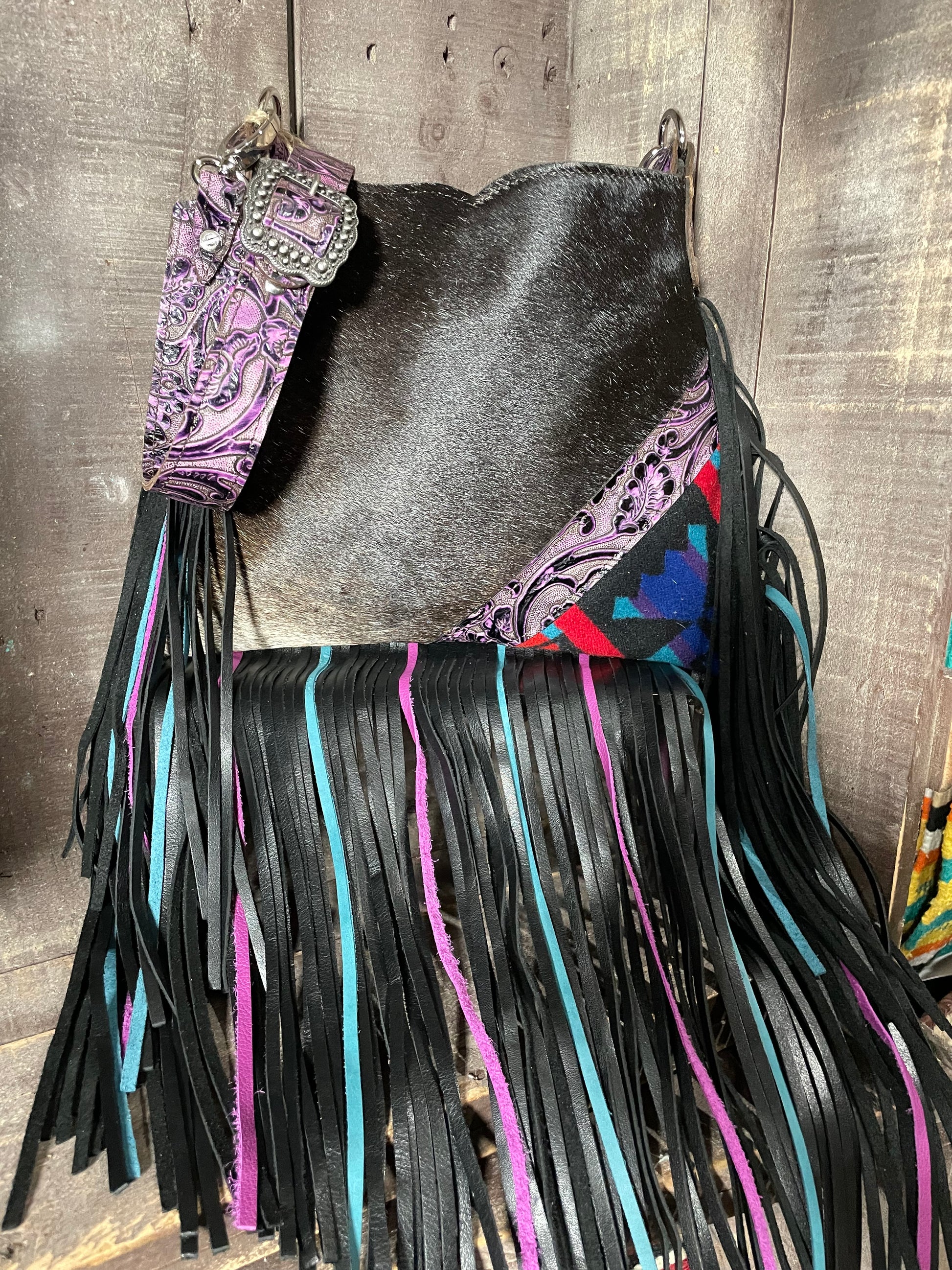 Genuine leather handbag in the H&M Ranch Store small hobo style. Handbag features hair on hide dark front completed with Pendleton wool corner . heavy embossed black and purple cowboy leather back. Interior has two coordinating leather pockets, magnetic snap closure, matching crossbody strap that measures 45" down to 38" from clip to clip, strap is detachable that allows for interchangeable straps, mini berry buckle, two conchos, and long 12" blank fringe with purple and blue peekaboo.